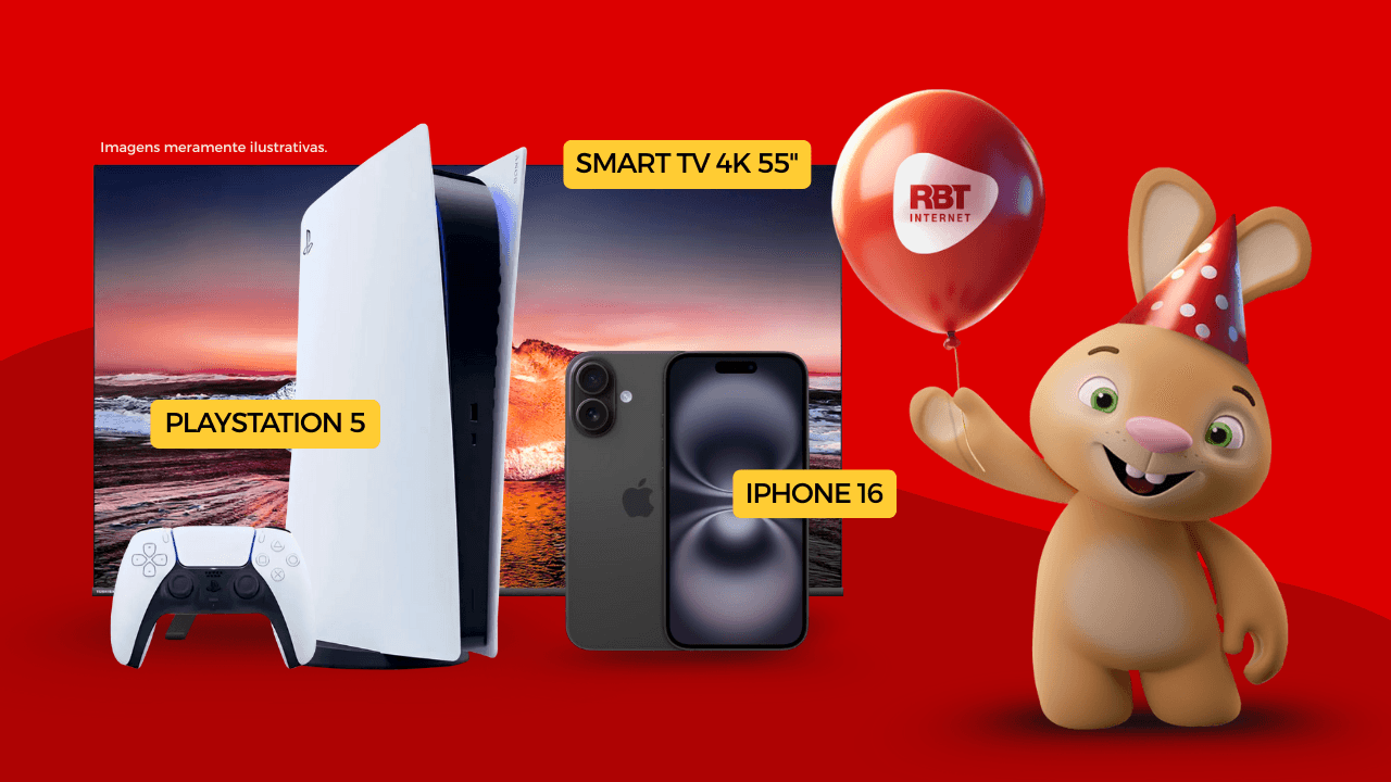Para celebrar a passagem de mais um aniversário, a RBT sorteará no fim do mês de maio, três super prêmios. Dentre eles estão um PS5, Iphone 16 e Smart TV 55’. Vale lembrar que a participação dos clientes no sorteio é de forma automática, bastando apenas estar com as faturas RBT em dia. O resultado será divulgado no fim do mês de maio nos canais oficiais da RBT Internet.